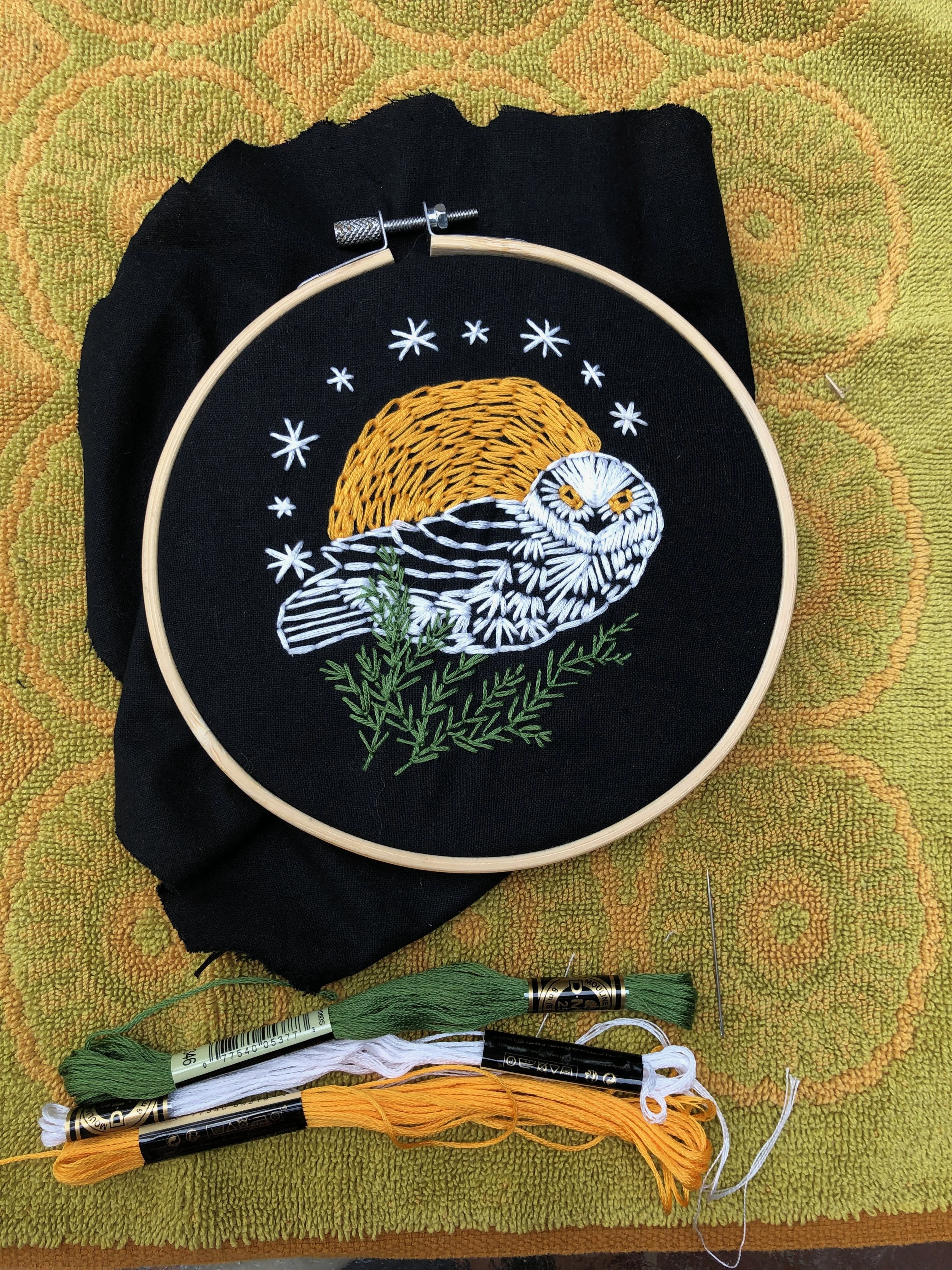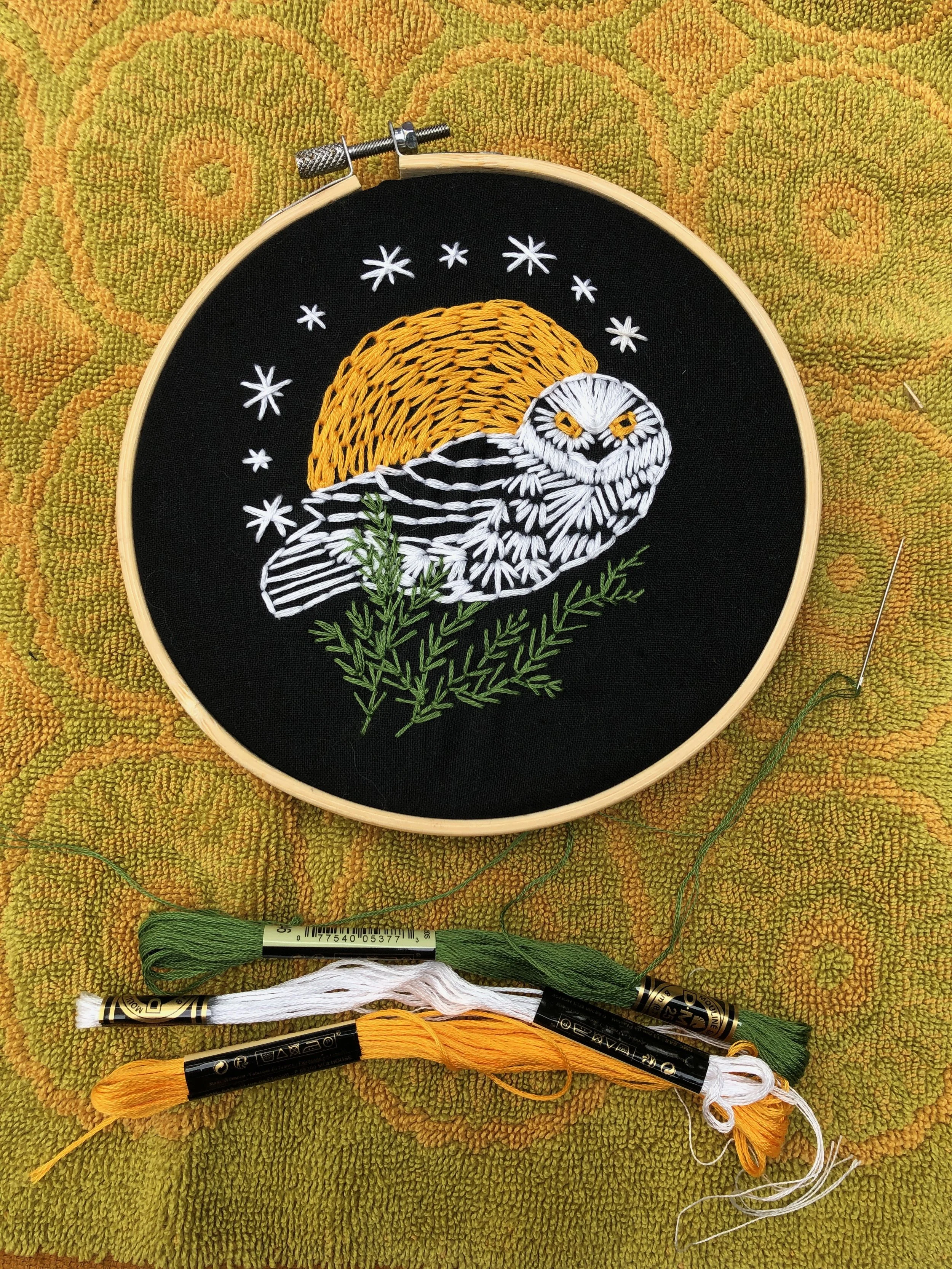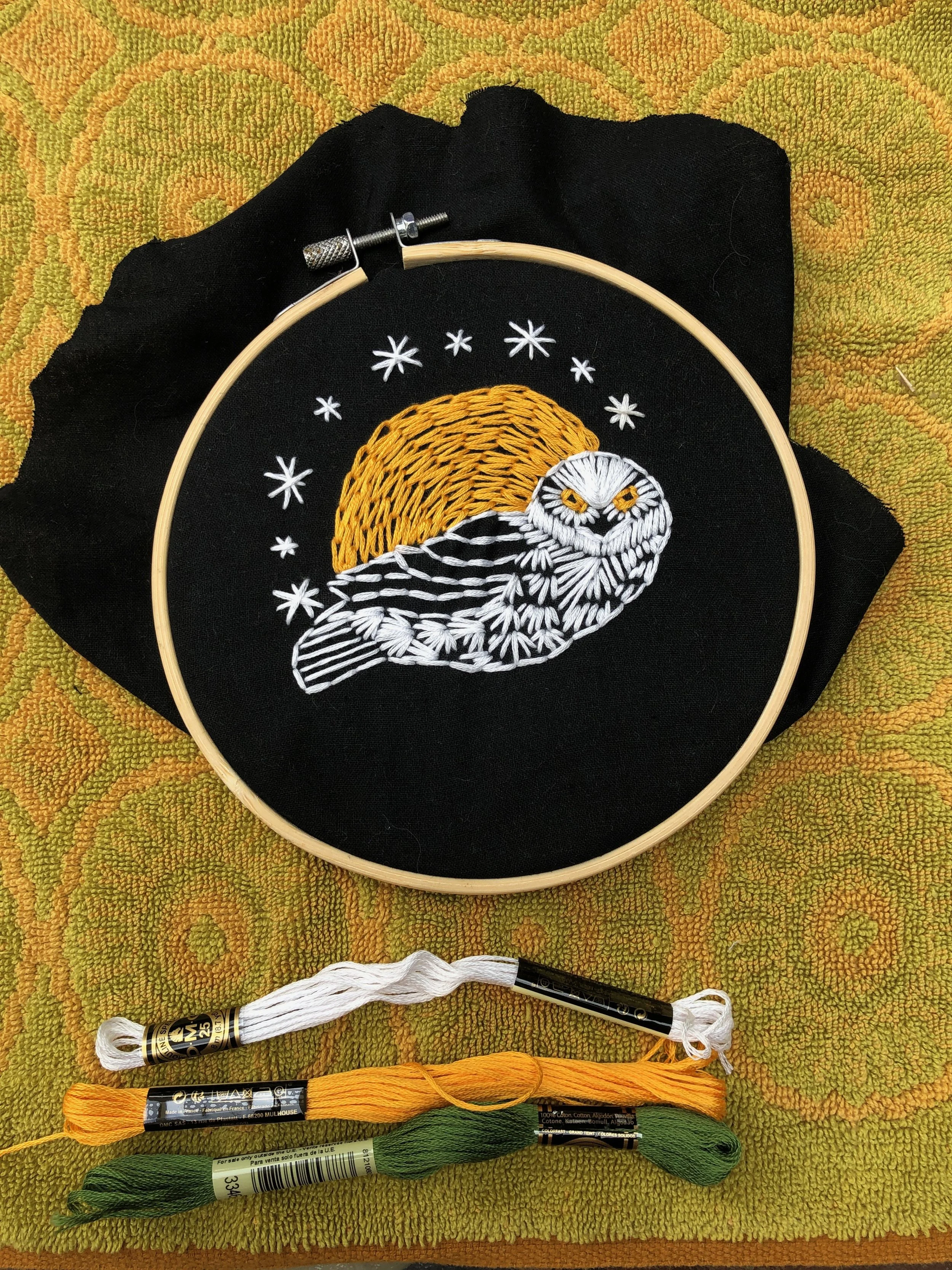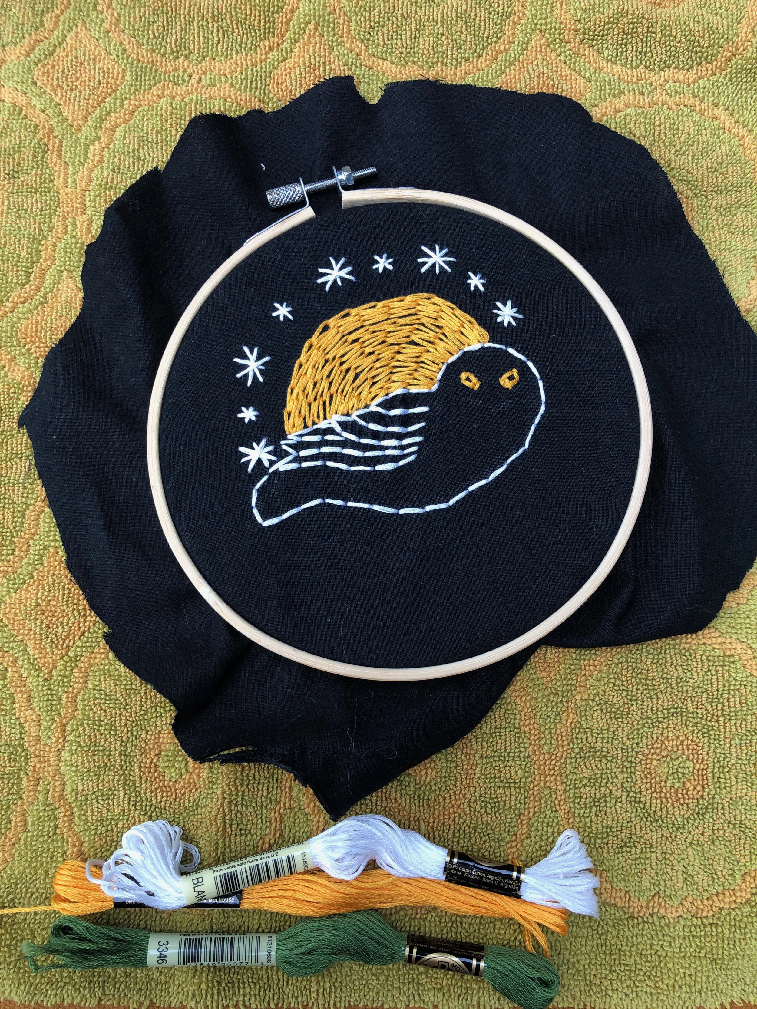 I included black thread incase you would like to go back in and stitch over the bill and pupils of the owls eyes. you can also use this in creative ways like creating a double outline around the owl, adding stars, stripes to its feathers, ect.